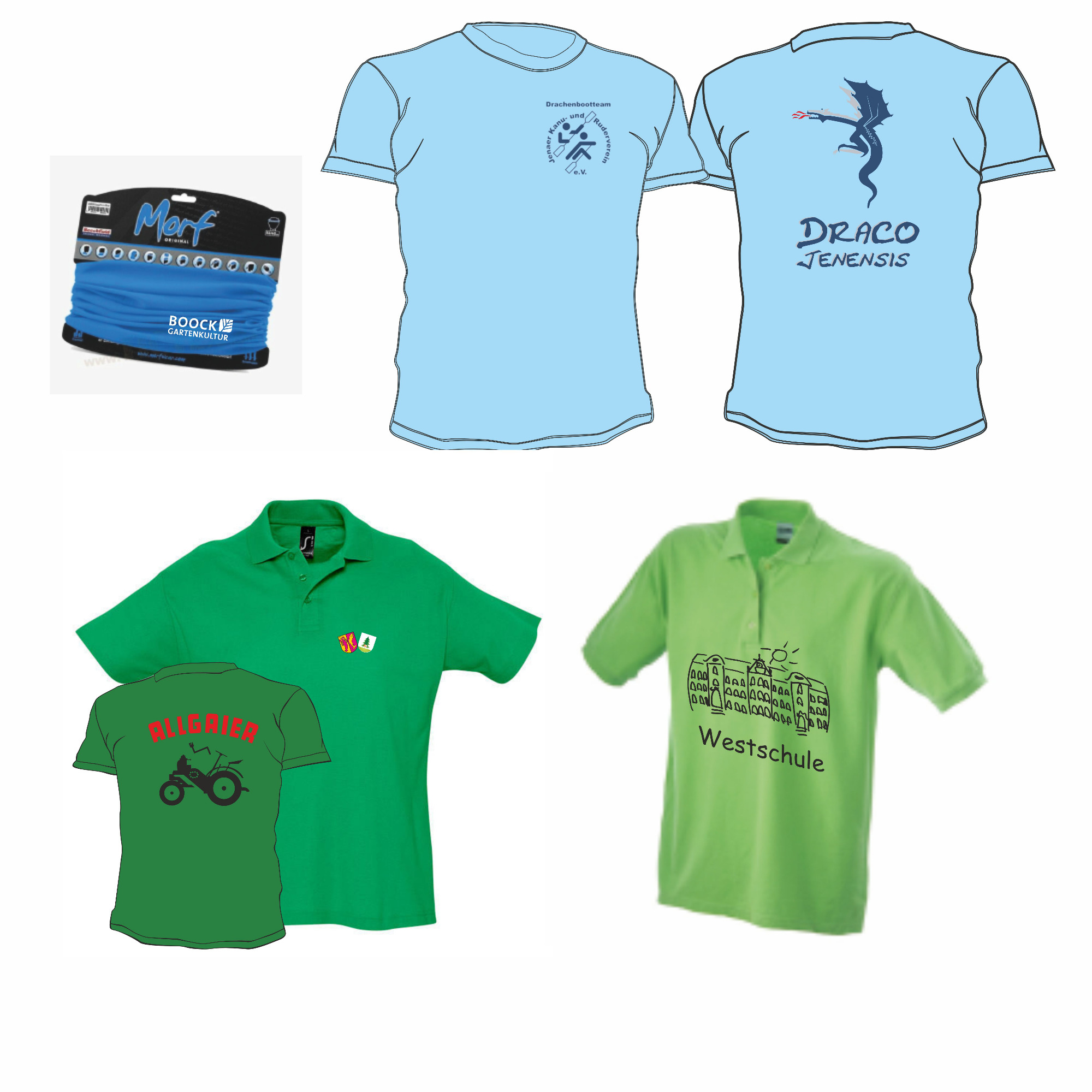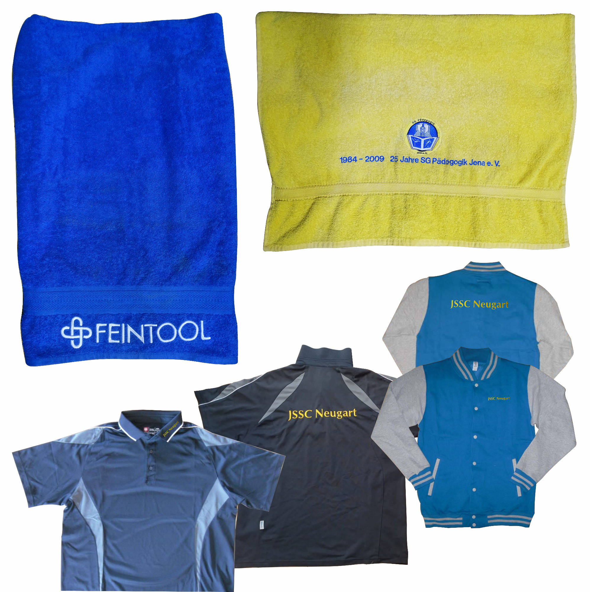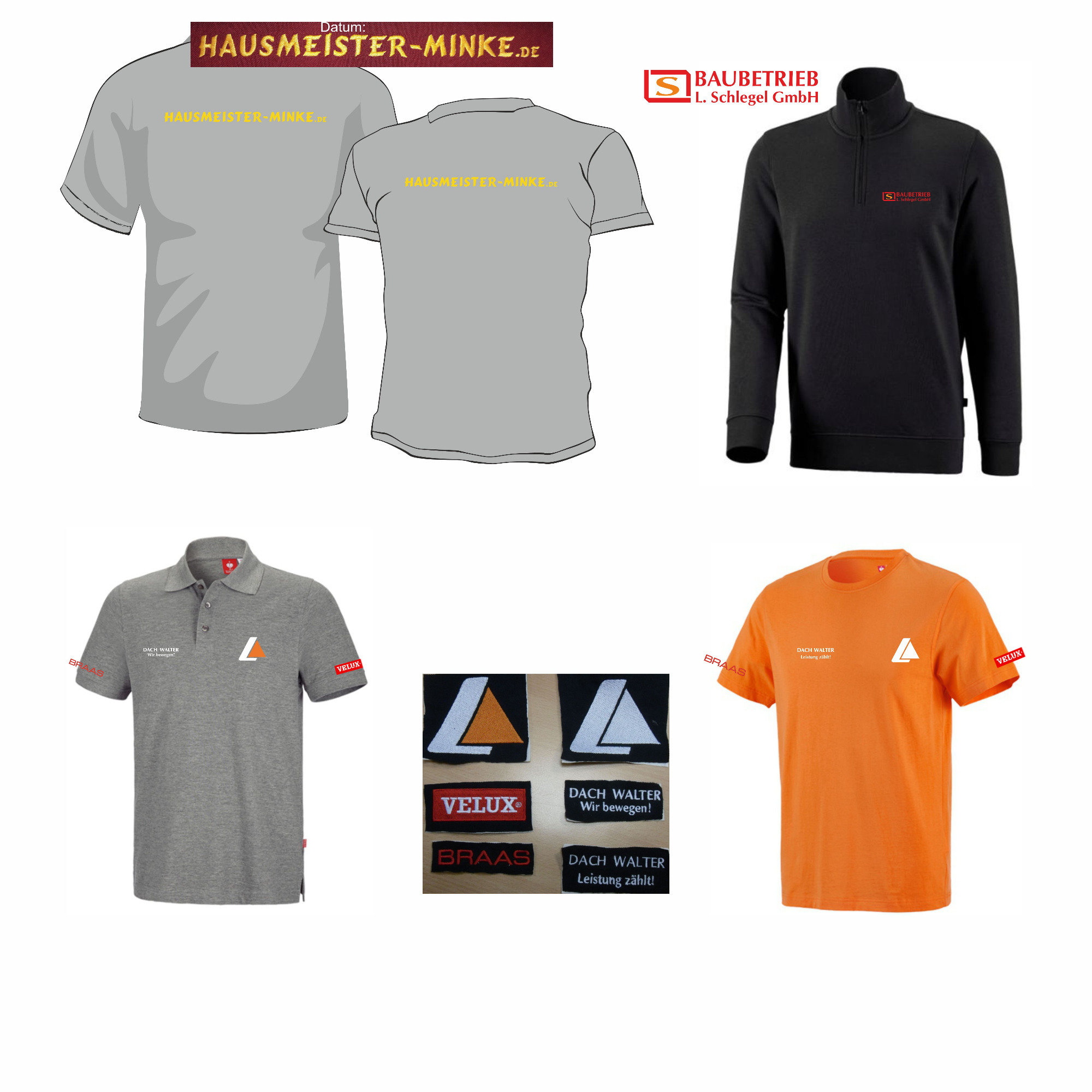 Die gezeigten Beispiele stehen für personalisierte Kleidungsstücke zu privaten, gewerblichen und vereinsbezogenen Anlässen.