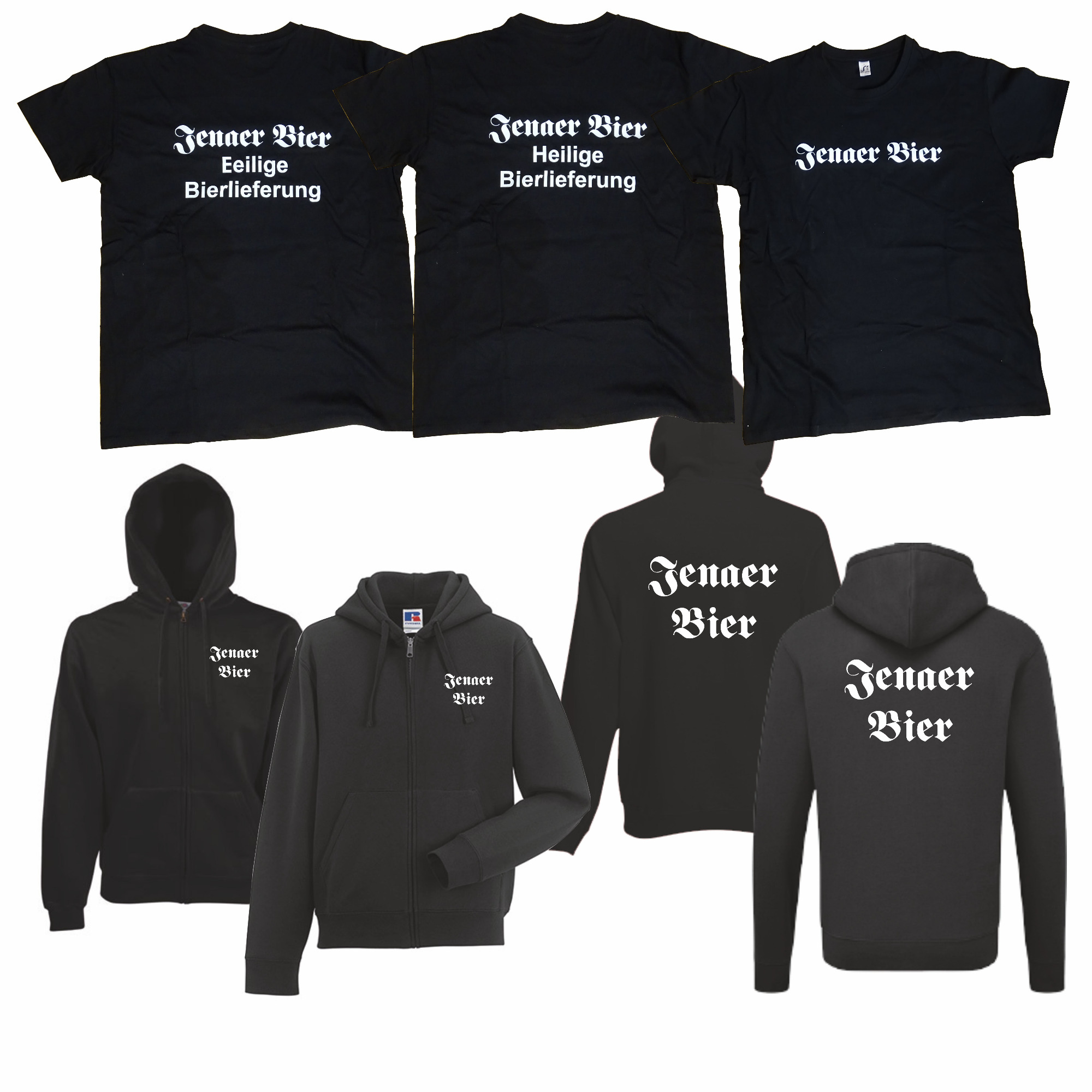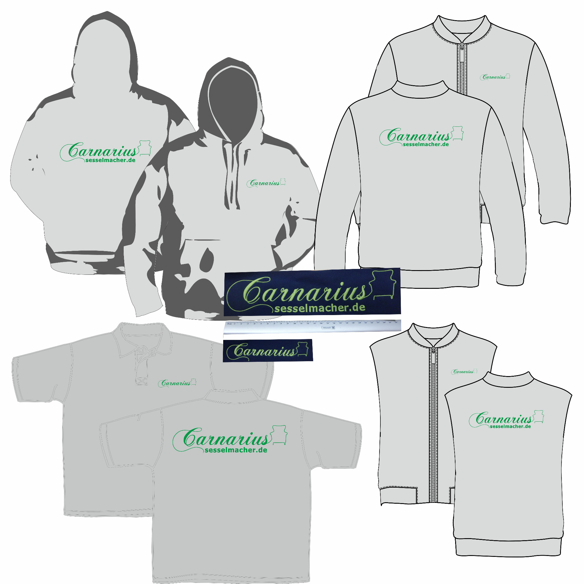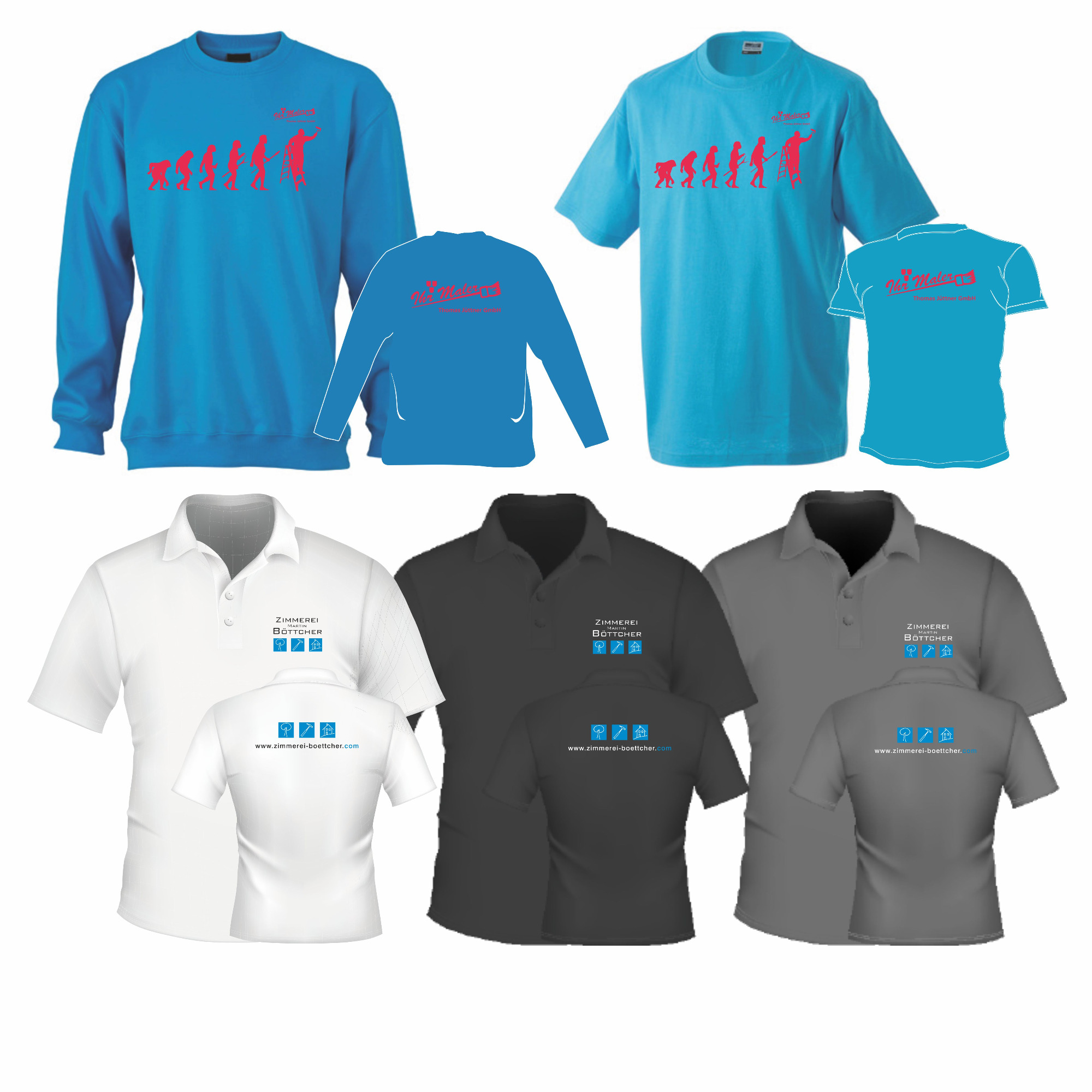 Die gezeigten Beispiele stehen für personalisierte Kleidungsstücke zu privaten, gewerblichen und vereinsbezogenen Anlässen.